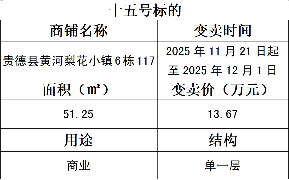 受委托,我公司于2025年11月21日上午10时起在青海省公共资源交易中心位于“青海省海南州贵德县黄河梨花小镇”15套商铺面向社会进行公开变卖。