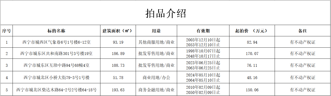 受委托,我公司于2025年12月31日上午11时在西宁市公共资源交易中心对西宁市城西区、城东区、城北区等地四套“商业用房”一套“办公用房”面向社会进行公开拍卖。