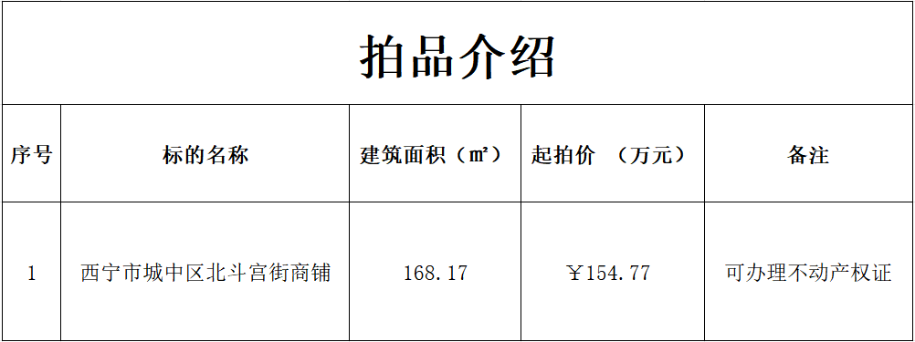 受委托,我公司于2025年3月13日上午10时在青海省公共资源交易中心对“西宁市城中区北斗宫街商铺”面向社会进行公开拍卖。