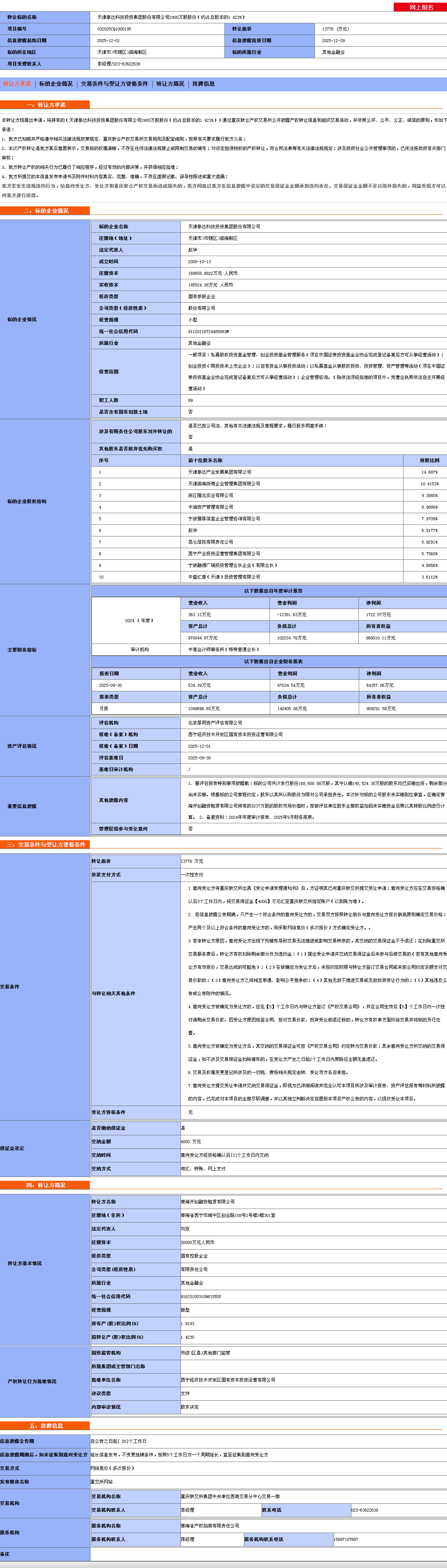 天津泰达科技投资集团股份有限公司2400万股股份(约占总股本的1.423%)