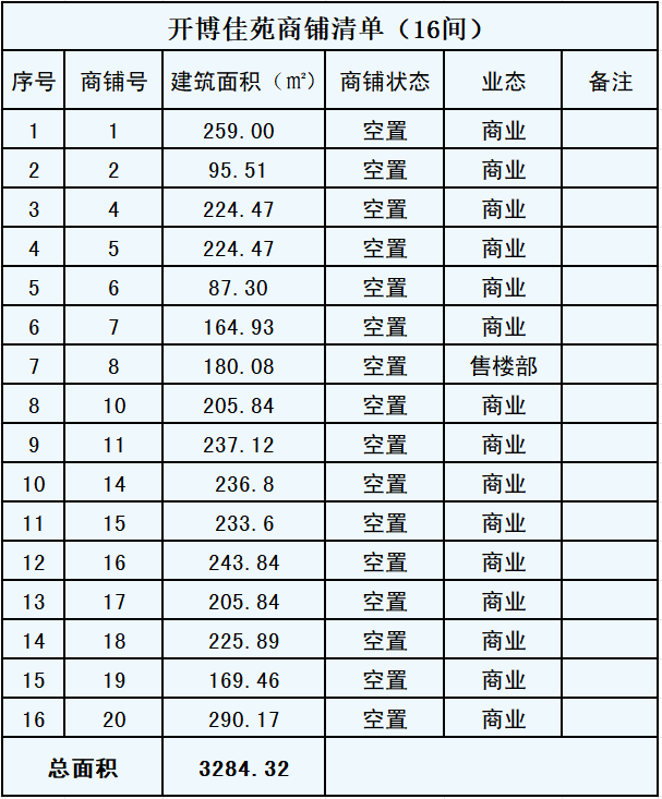 南川开博佳苑商铺位于西宁市城中区麟河路31号,坐拥优越的地理位置与成熟的社区环境。本次招商共推出 16间商铺,总面积 3284.32㎡,空间布局灵活,可满足多元化经营需求,是投资创业、品牌拓展的理想之选。